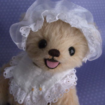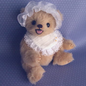 委託ベアとして作ったコですが、お披露目したくなっちゃいました。膝を曲げておすわりしている赤ちゃんベアです。 耳出しボンネットとスタイがかわいいんです。 抱っこして下さる方が見つかるといいなぁ。 お家がきまりました